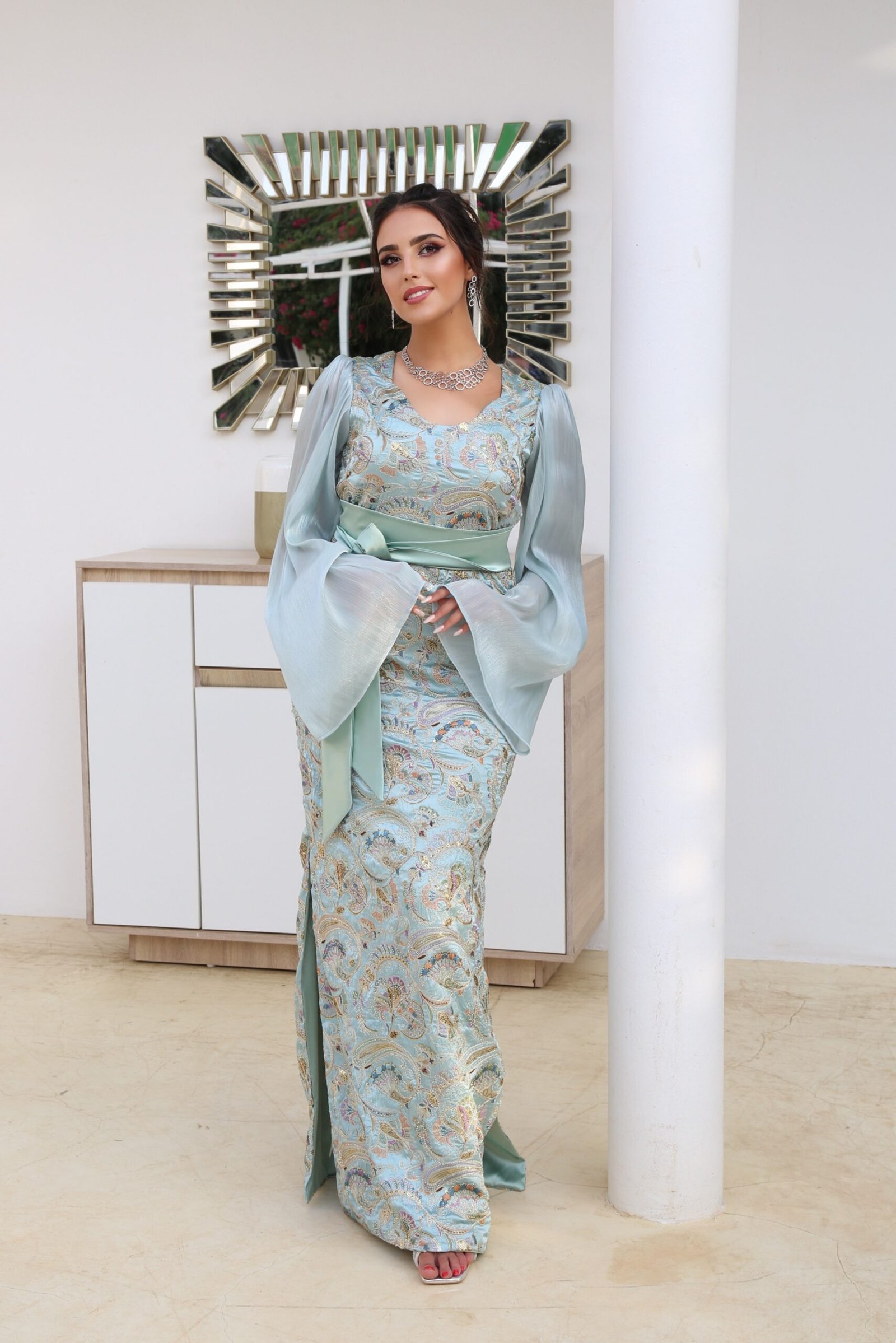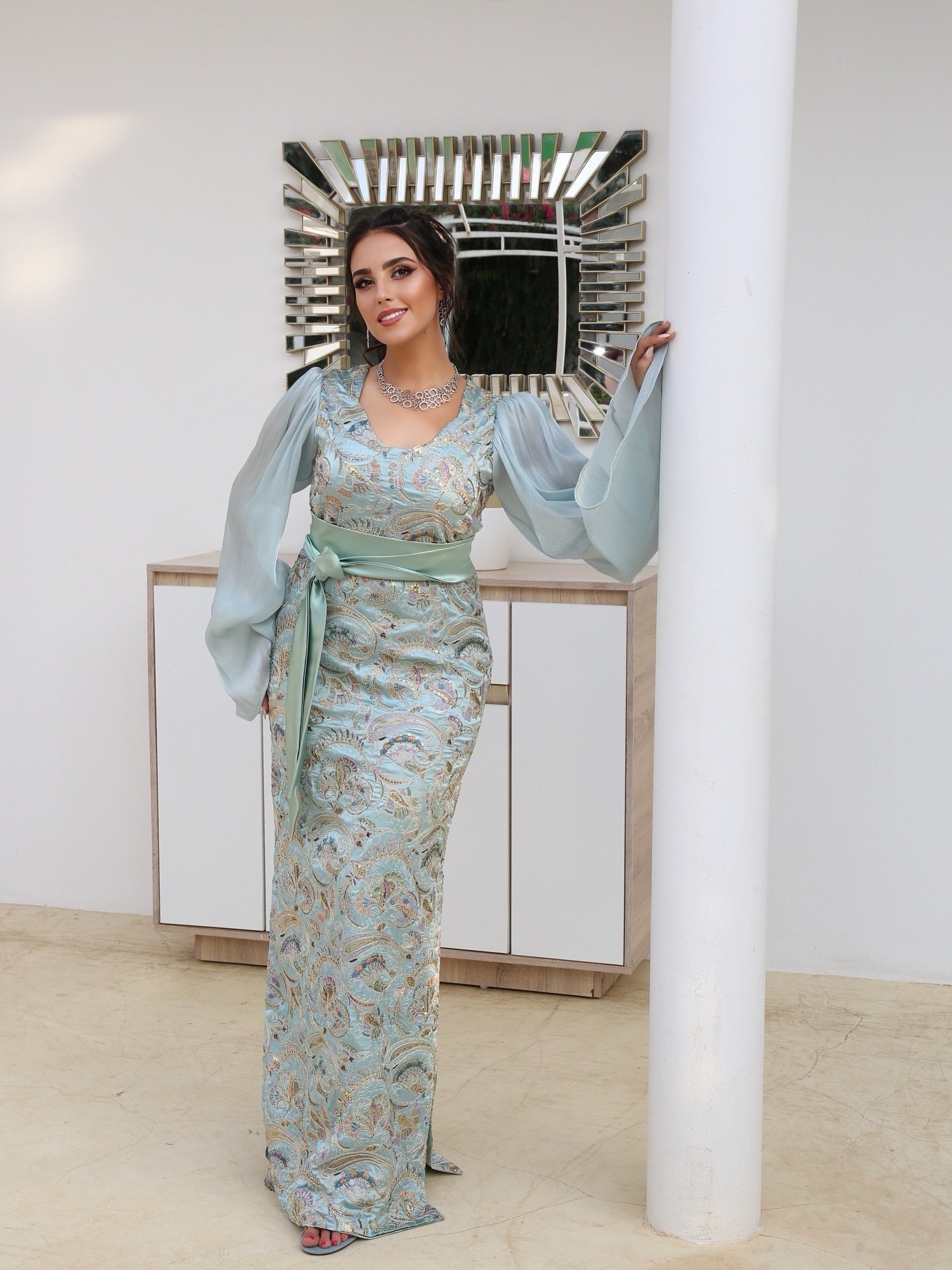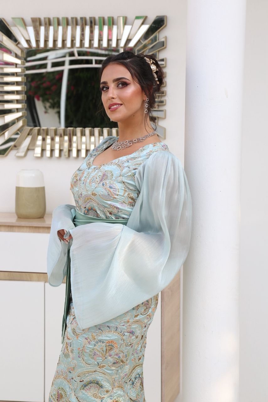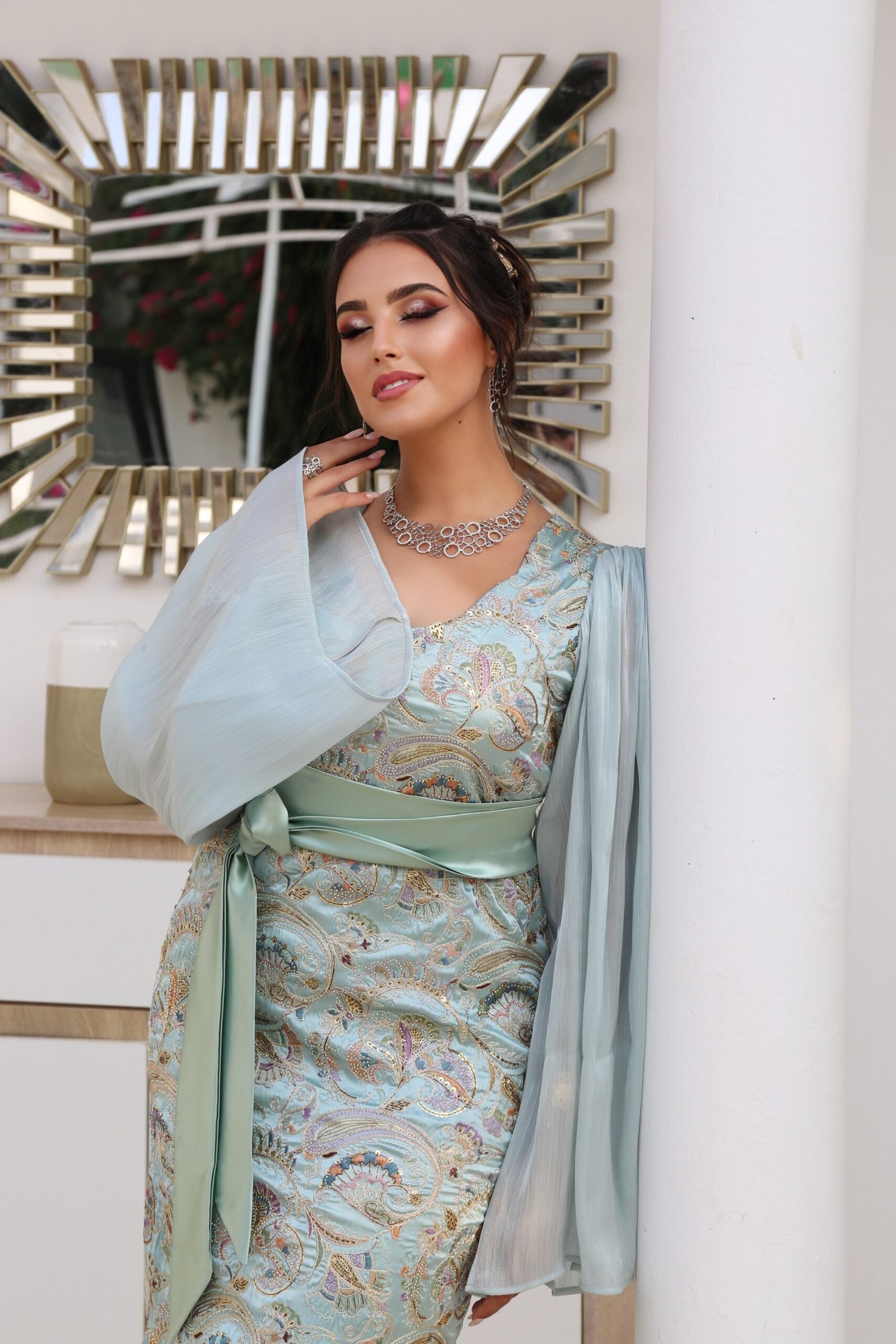 Robe très chic faite en tissu sari satin brodé avec une doublure entièrement en satin de soie et des manche en organza